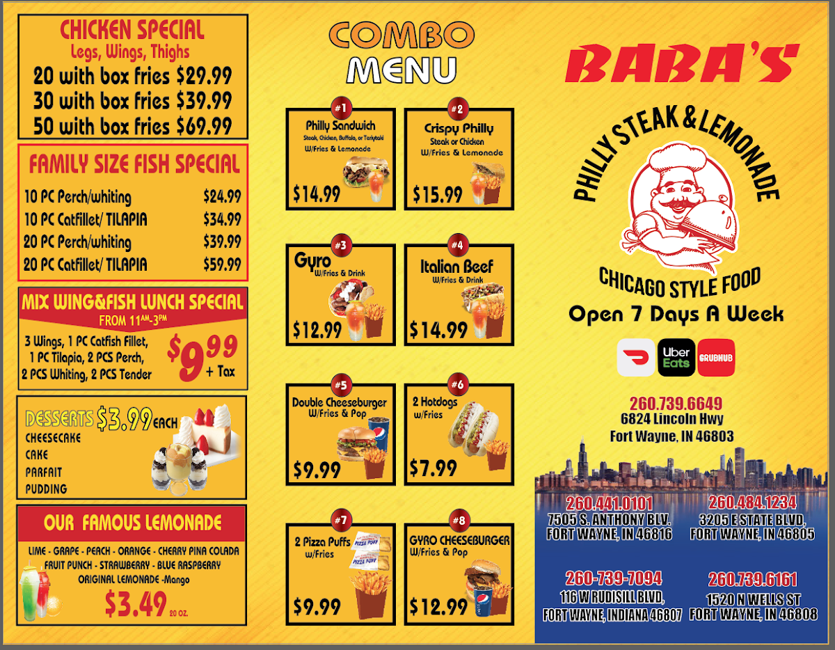 Introducing Baba's Steak and Lemonade, a culinary gem located at 3205 E State Blvd in Fort Wayne, IN. This vibrant eatery specializes in fried delights, with a menu that features mouthwatering cheesesteaks, crispy catfish, and flavorful gyros crafted from a delicious blend of lamb and beef.